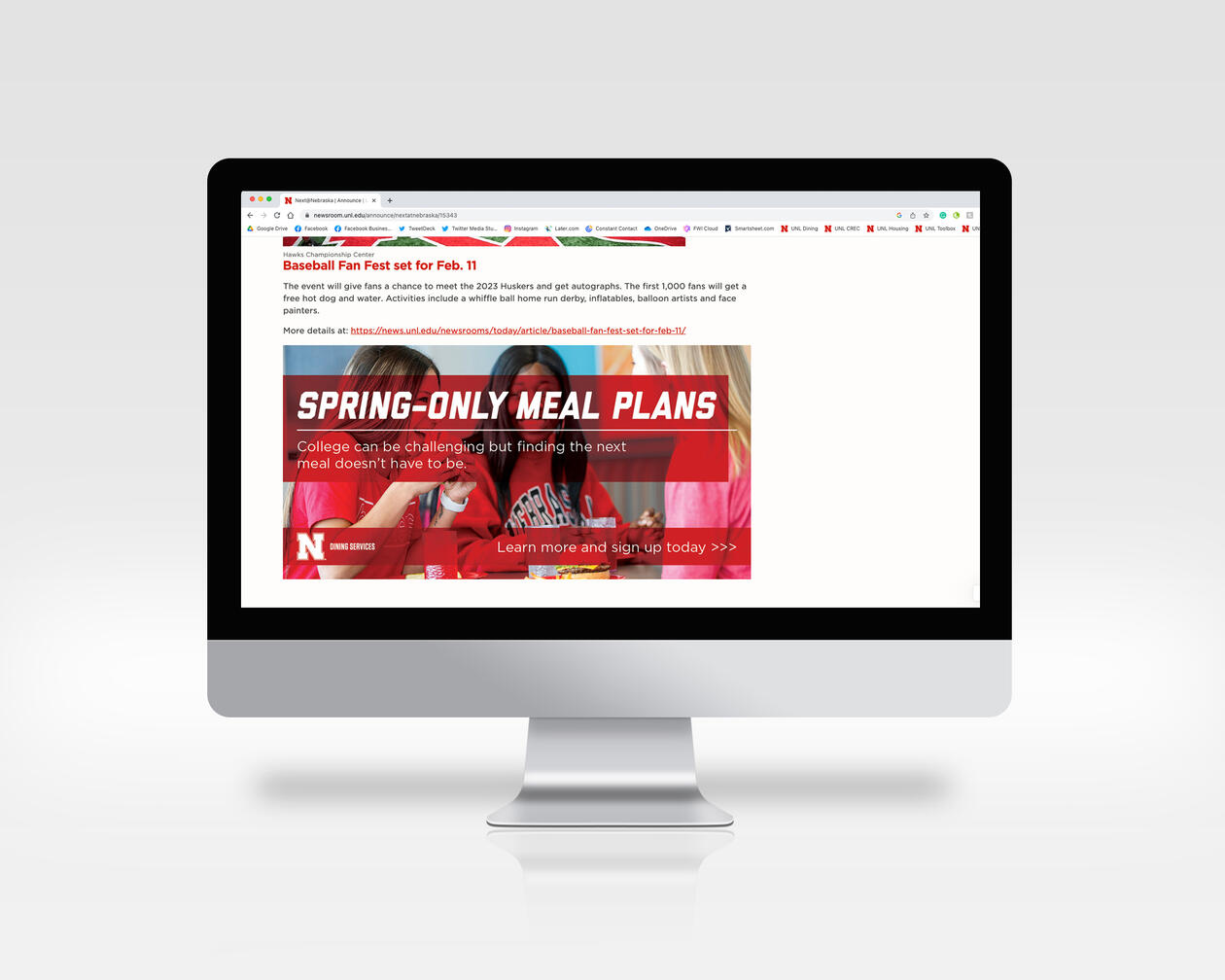 As the lead marketing professional assigned to Dining Services, I successfully led efforts to promote and sell returning student (meal-only) meal plans. The main audience for this campaign were returning students who either chose not to live with University Housing the following year or chose to live in a housing option that did not require a meal plan.This was a multi-faceted campaign that utilized several tactics including direct email to both students and their parents/guardians, social media, campus digital signage, online newsletter publications, mobile app notifications, and printed materials used at various tabling events, among others.The overall goal was 1,000 meal plans sold, and the campaign resulted in:• 950+ returning student (meal-only) meal plans sold (95% of the overall goal)